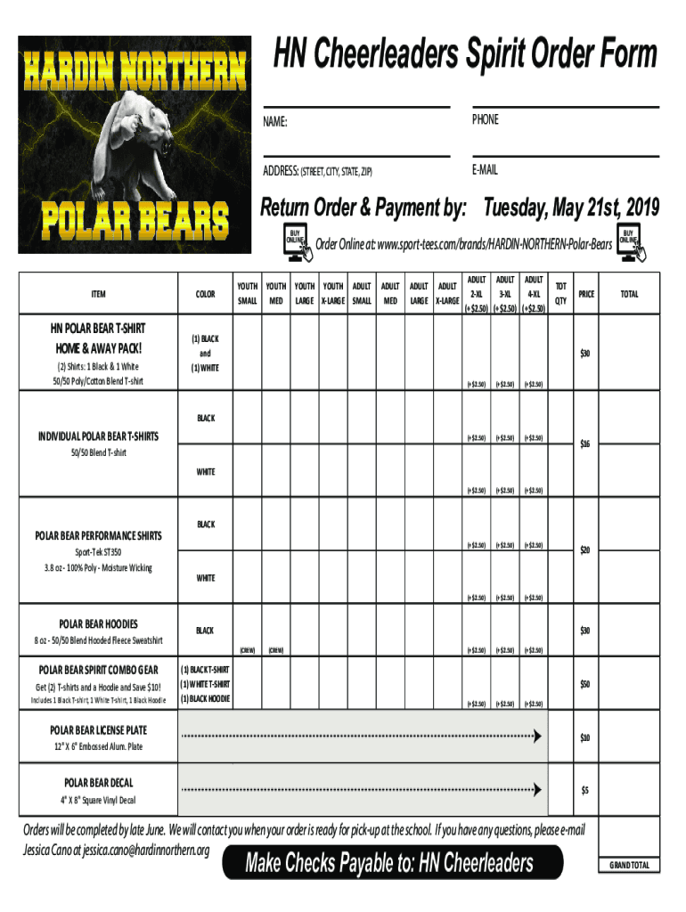 IN Cheerleaders Spirit Order Form NAME:HEADDRESS: (STREET, CITY, STATE, ZIP)EMAILReturn Order & Payment by: BUY ONLINEITEMHN POLAR BEAR SHIRT HOME & AWAY PACK! (2) Shirts: 1 Black & 1 White 50/50