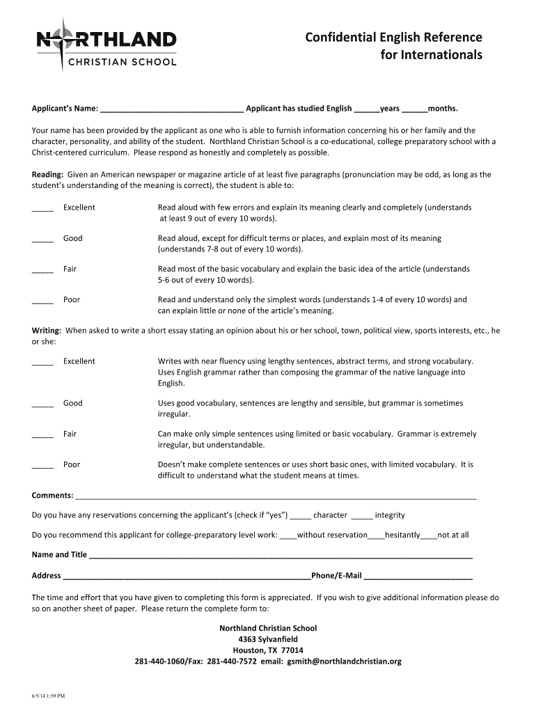 Confidential English Reference for Internationals Applicants Name: Applicant has studied English years months. Your name has been provided by the applicant as one who is able to furnish information