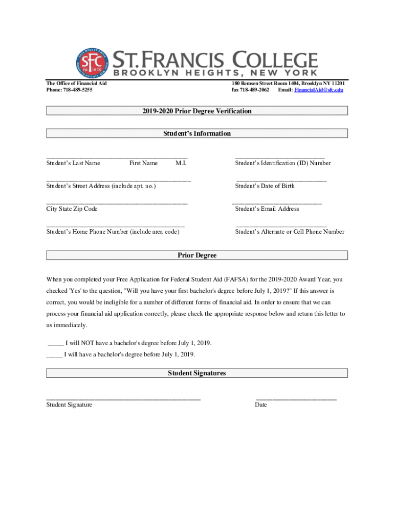 The Office of Financial Aid Phone: 7184895255180 Rem sen Street Room 1404, Brooklyn NY 11201 fax 7184892062 Email: Financial SFC.edu20192020 Prior Degree Verification Students Information Students