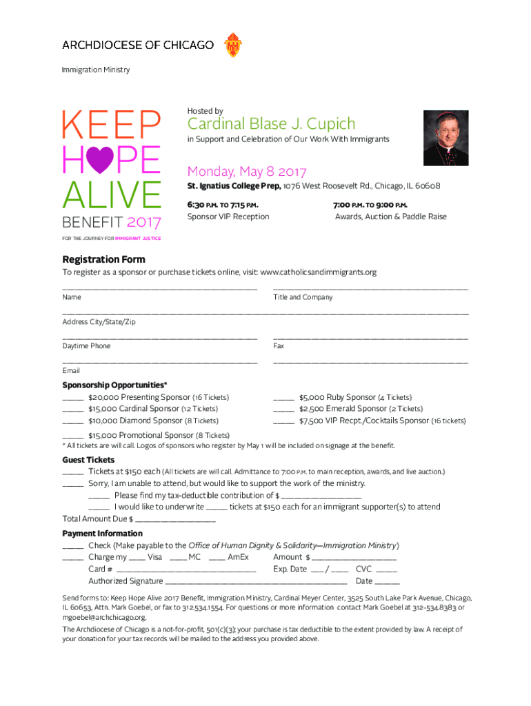 Immigration MinistryKEEP Co-hosted alive 2017St. Ignatius College Prep, 1076 West Roosevelt Rd., Chicago, IL 60608BENEFITCardinal Blasé J. Munich in Support and Celebration of Our Work With Immigrants