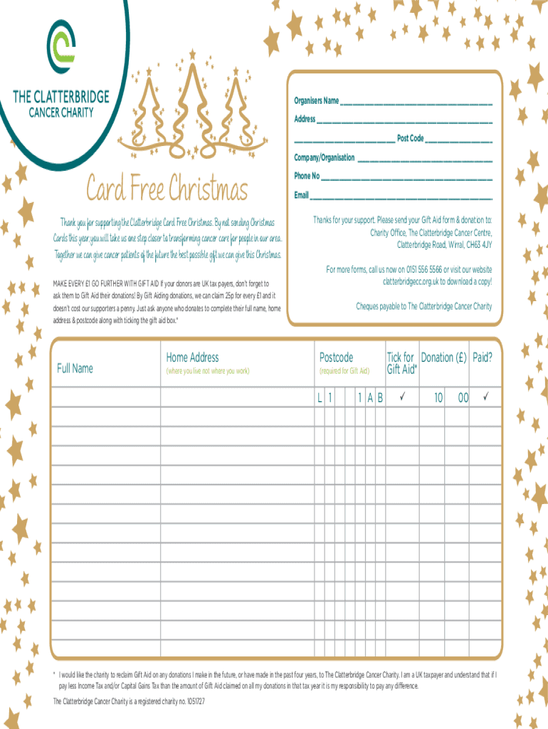 Organizers Name Address Post Code Company/Organization Card Free ChristmasThank you for supporting the Clatter bridge Card Free Christmas. By not sending Christmas Cards this year, you will take us