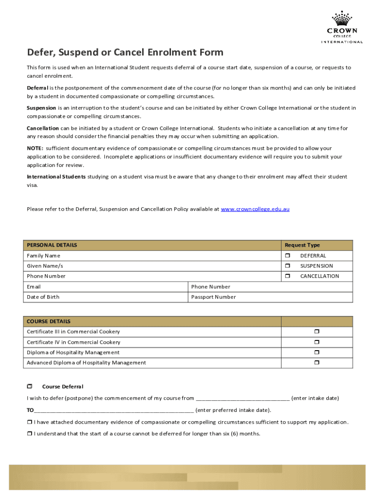 Get the free Defer, Suspend or Cancel Enrolment Form - Crown College