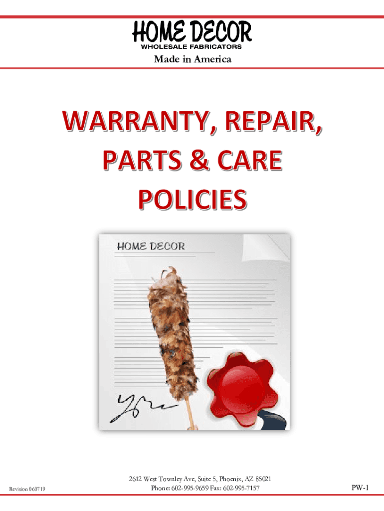 Made in AmericaRevision 0607192612 West Conley Ave, Suite 5, Phoenix, AZ 85021 Phone: 6029959659 Fax: 6029957157PW1Made in AmericaWARRANTY, REPAIR & CARE FEATURESRevision 060719General Warranty PoliciesResidential