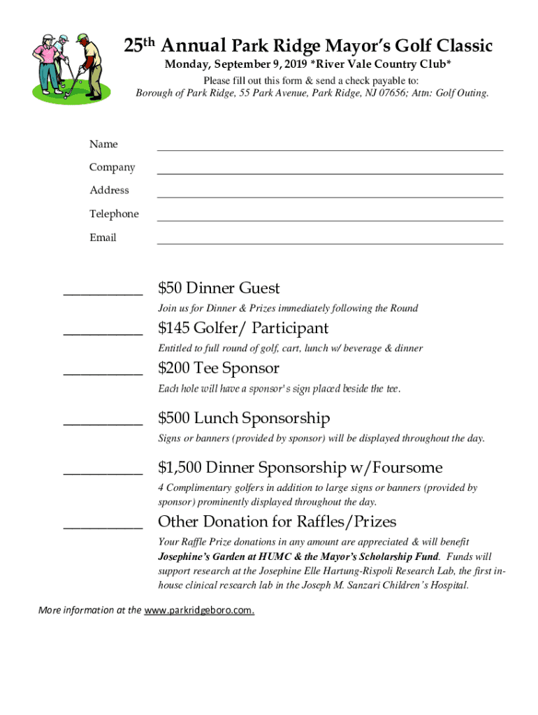 25th Annual Park Ridge Mayors Golf Classic Monday, September 9, 2019 *River Vale Country Club* Please fill out this form & send a check payable to: Borough of Park Ridge, 55 Park Avenue, Park Ridge,