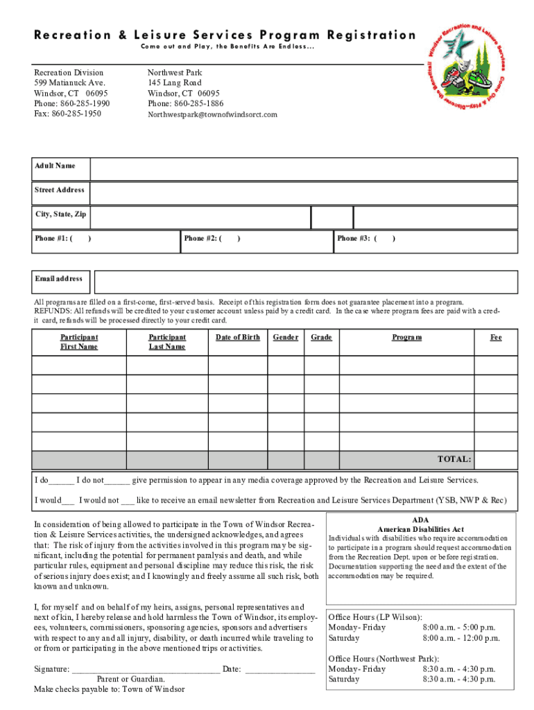 Rear ea ton & Leisure Services Program Re gist a ton Come out and Play, the Benefits Are Endless... Recreation Division 599 Matianuck Ave. Windsor, CT 06095 Phone: 8602851990 Fax: 8602851950Northwest