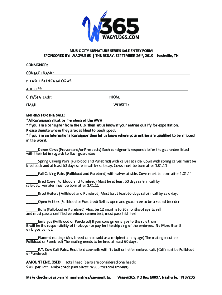 MUSIC CITY SIGNATURE SERIES SALE ENTRY FORM SPONSORED BY: WAGYU365 THURSDAY, SEPTEMBER 26TH, 2019 Nashville, TN CONSIGNOR: CONTACT NAME: PLEASE LIST IN CATALOG AS: ADDRESS: CITY/STATE/ZIP: PHONE: