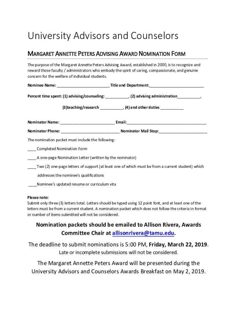 University Advisors and Counselors MARGARET ANNETTE PETERS ADVISING AWARD NOMINATION FORM The purpose of the Margaret Annette Peters Advising Award, established in 2000, is to recognize and reward