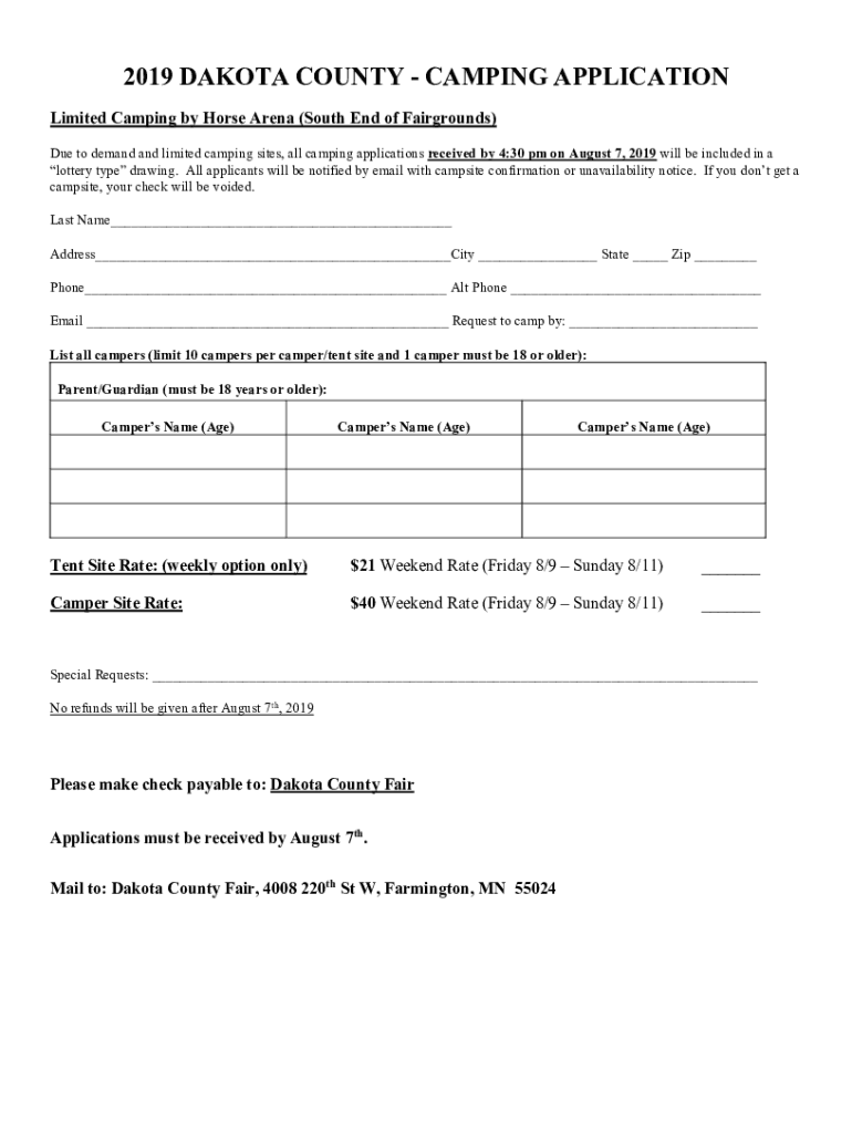 2019 DAKOTA COUNTY CAMPING APPLICATION Limited Camping by Horse Arena (South End of Fairgrounds) Due to demand and limited camping sites, all camping applications received by 4:30 pm on August 7,