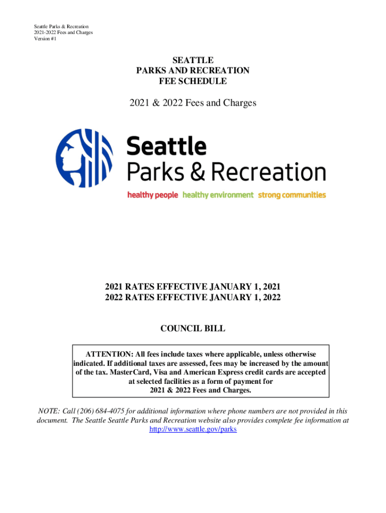 Seattle Parks & Recreation 20212022 Fees and Charges Version #1SEATTLE PARKS AND RECREATION FEE SCHEDULE2021 & 2022 Fees and Charges2021 RATES EFFECTIVE JANUARY 1, 2021 2022 RATES EFFECTIVE JANUARY