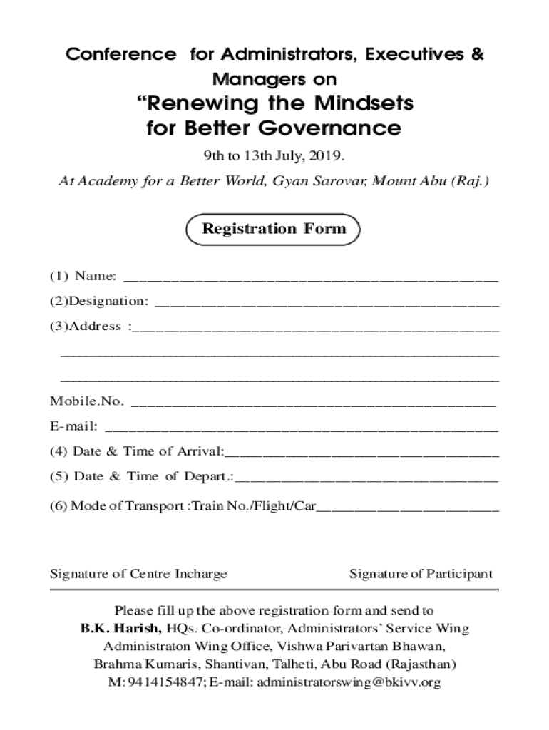 Conference for Administrators, Executives & Managers renewing the Mindsets for Better Governance 9th to 13th July 2019. At Academy for a Better World, Ryan Samovar, Mount Abu (Raj.) Registration Form
