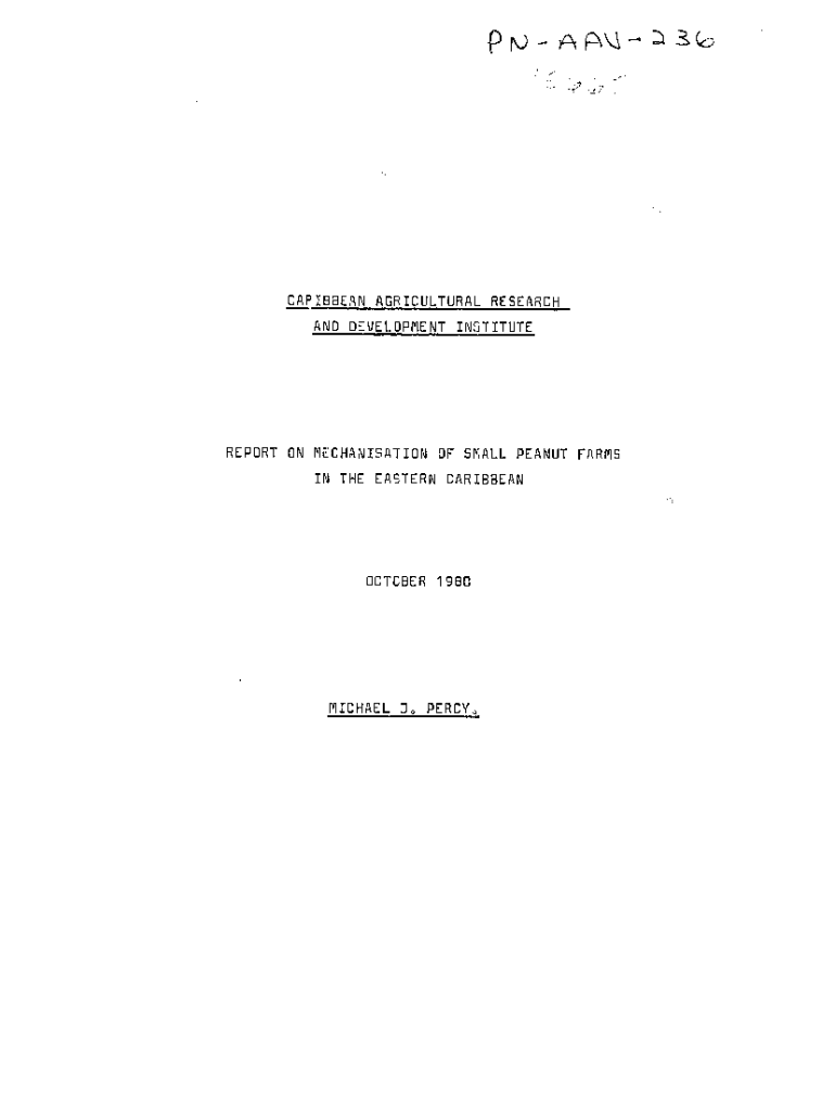 CARIBBEAN AGRICULTURAL RESEARCH AND DEVELOPMENT INSTITUTEREPORT MECHANIZATION OF SMALL PEANUT FAR MSIN THE EASTERN CARIBBEANOCTOBER 1980MICHAEL J. PERCY.CONTENTSPAGEreface1ackground to Study2eneral