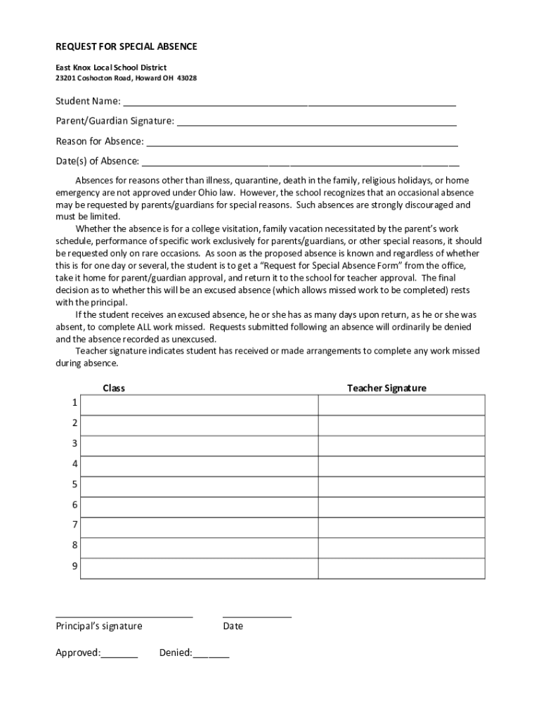 REQUEST FOR SPECIAL ABSENCE East Knox Local School District 23201 Concoction Road, Howard OH 43028Student Name: Parent/Guardian Signature: Reason for Absence: Date(s) of Absence: Absences for reasons
