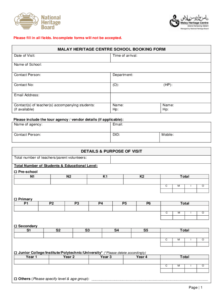 Get the free PDF MALAY HERITAGE CENTRE SCHOOL BOOKING FORM DETAILS ...