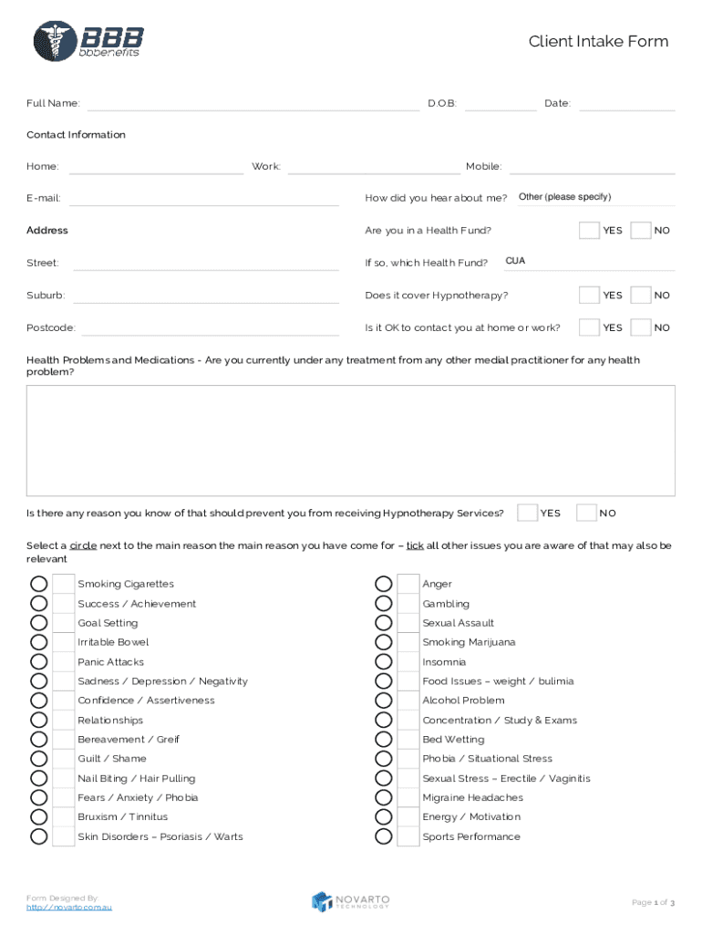Client Intake Formula Name:D.O.B:Date:Contact Information Home:Work:Mobile:Email:How did you hear about me? Addressable you in a Health Fund? Street:If so, which Health Fund? Suburb: Postcode:Other