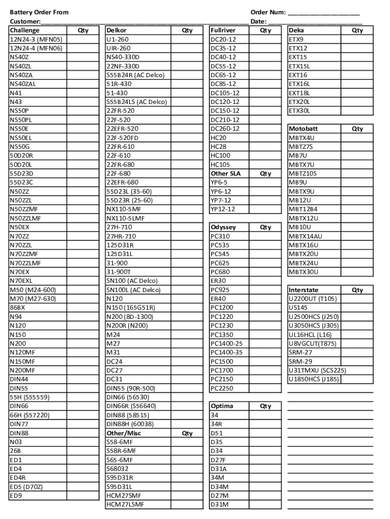 Battery Order From Order Sum: Customer: Date: Challenge Qty Decor Qty Full river Qty Dena Qty 12N243 (MFN05) U1260 DC2012 ETX9 12N244 (MFN06) UIR260 DC3512 ETX12 NS40Z NS40330D DC4012 EXT15 NS40ZL