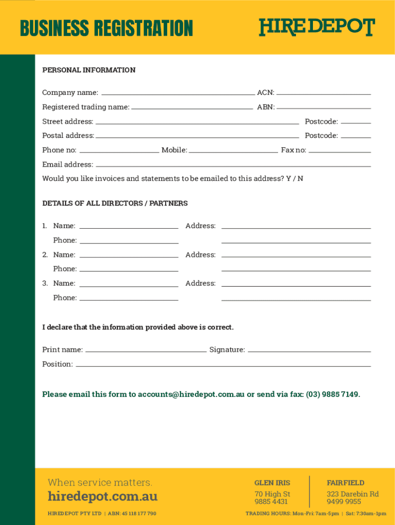 Anyone who runs or owns hiredepot or is legally responsible for managing its operation requires business information.