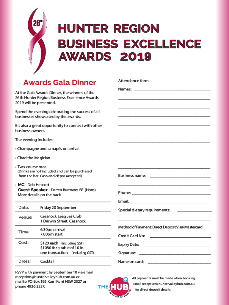 Awards Gala Dinner At the Gala Awards Dinner, the winners of the 26th Hunter Region Business Excellence Awards 2019 will be presented. Spend the evening celebrating the success fall businesses showcased