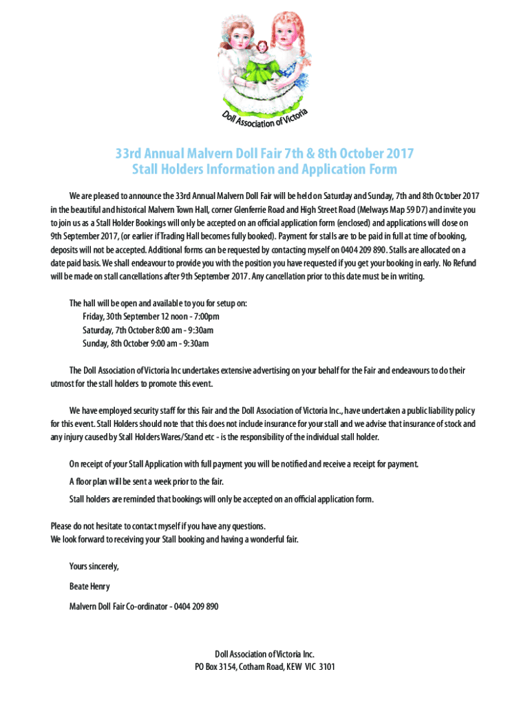 33rd Annual Tavern Doll Fair 7th & 8th October 2017 stallholders Information and Application Form We are pleased to announce the 33rd Annual Tavern Doll Fair will be held on Saturday and Sunday, 7th
