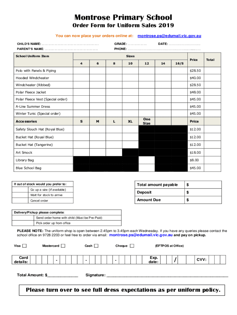 Montrose Primary School Order Form for Uniform Sales 2019 You can now place your orders online at:montrose.ps email.Vic.gov.child NAME: ...GRADE: PARENTS NAME:.PHONE: ........ School Uniform Iterate: