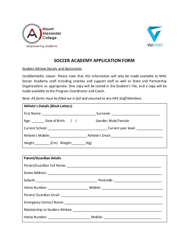SOCCER ACADEMY APPLICATION FORM