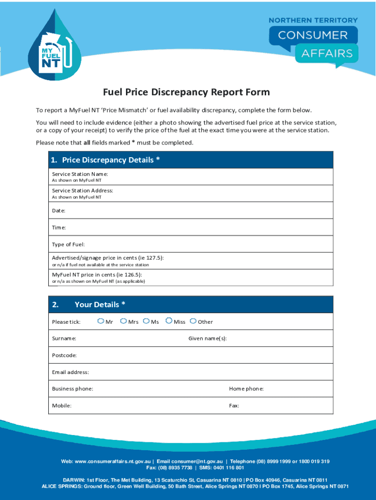 Get the free Fuel Price Discrepancy Report Form - consumeraffairs.nt.gov.au