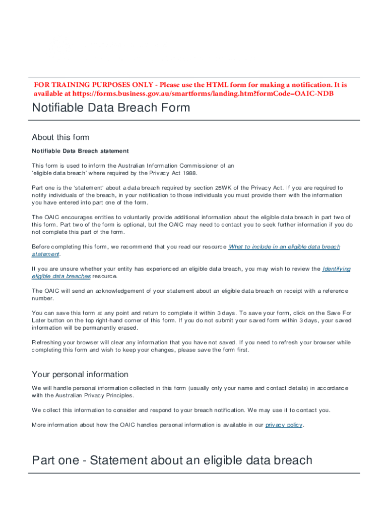 FOR TRAINING PURPOSES ONLY Please use the HTML form for making a notification. It is available at https://forms.business.gov.au/smartforms/landing.htm?formCodeOAICNDBNotifiable Data Breach Form About