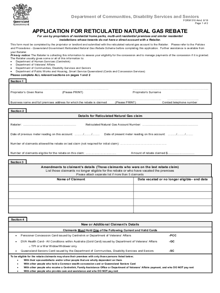 Department of Communities, Disability Services and Seniors FORM 510 AMD. 8/18-Page 1 of 2APPLICATION FOR RETICULATED NATURAL GAS REBATE For use by proprietors of residential home parks, multiunit