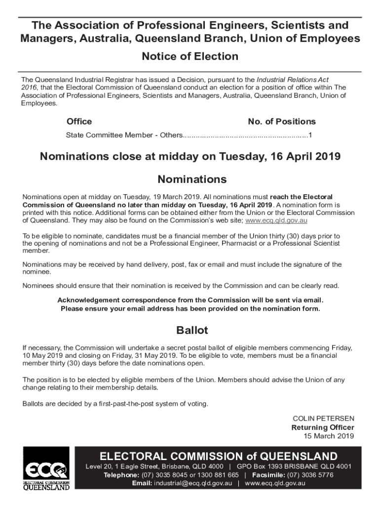 The Association of Professional Engineers, Scientists and Managers, Australia, Queensland Branch, Union of Employees Notice of Election The Queensland Industrial Registrar has issued a Decision, pursuant