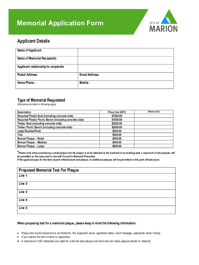 Get the free Memorial Application Form 2019