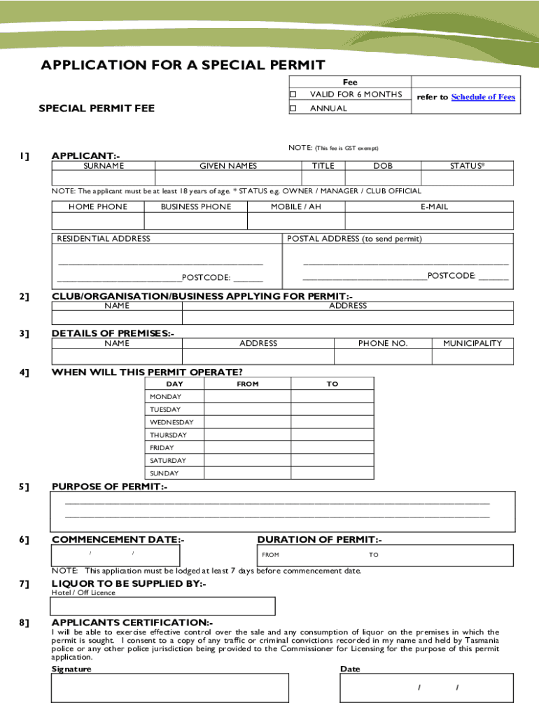 APPLICATION FOR A SPECIAL PERMIT FEE1 Fee VALID FOR 6 MONTHSANNUALrefer to Schedule of Denote: (This fee is GST exempt)APPLICANT:SURNAMEGIVEN NAMESTITLEDOBSTATUS×NOTE: The applicant must be at least