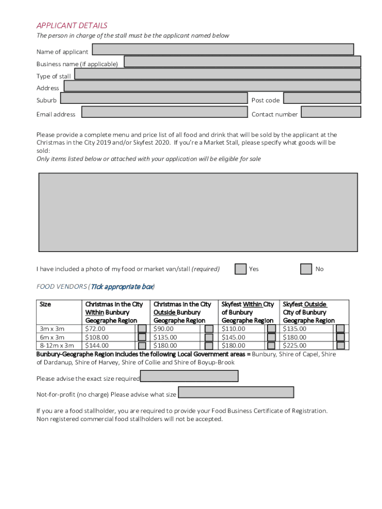 City of Bunbury Stallholder Expression of Interest Form Applications Close: Friday 6 September 2019Christmas in the City Sunday 8 December 2019, 3pm 8.30pm Graham Bracknell Music Shell & Bicentennial