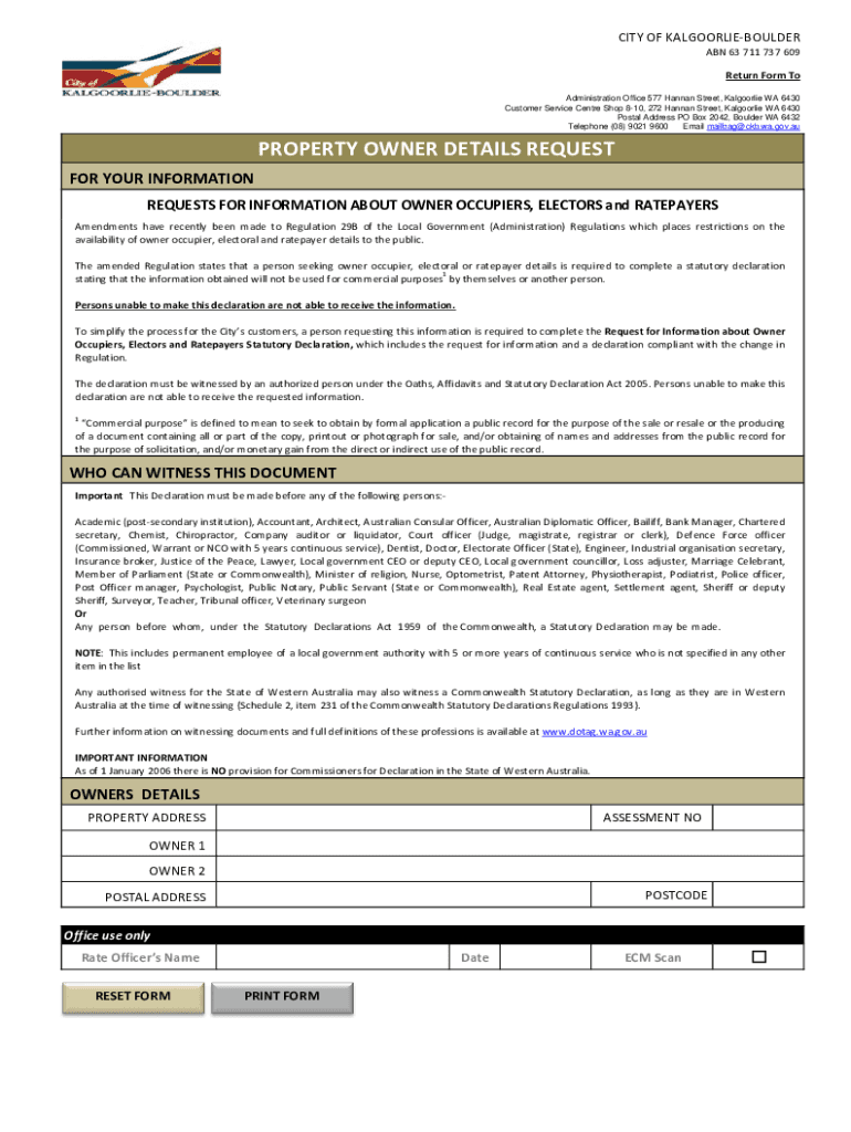 Return Form Toad ministration Office 577 Hanna Street, Kalgoorlie WA 6430