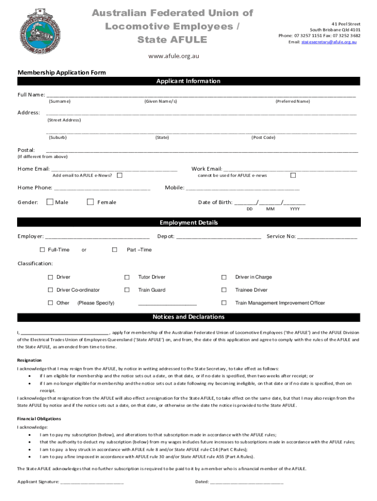 Australian Federated Union of Locomotive Employees / State AFULE41 Peel Street South Brisbane QLD 4101 Phone: 07 3257 1151 Fax: 07 3252 3682 Email: state secretary full.org.AUW.full.org.AU Membership