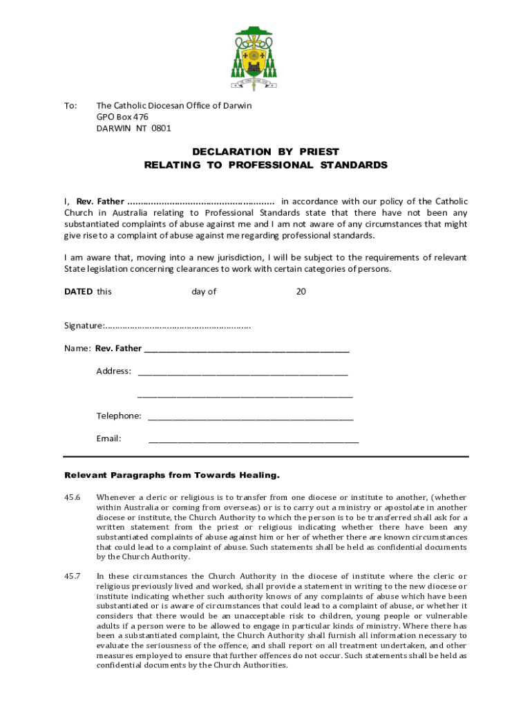 Get the free DECLARATION BY PRIEST RELATING TO PROFESSIONAL STANDARDS - darwin catholic org