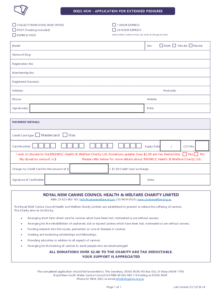 DOGS NSW APPLICATION FOR EXTENDED PEDIGREECOLLECT FROM DOGS NSW OFFICE1 HOUR EXPRESS POST (Tracking Included)24 HOUR EXPRESSEXPRESS POST(Select either Collect or Post, See Scale of Charges for fees)Breed:Sex:MaleFemaleNeuterName