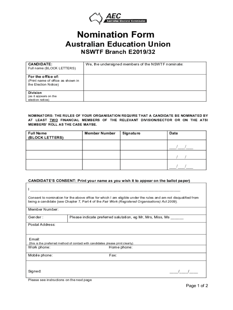 Nomination Form Australian Education Union