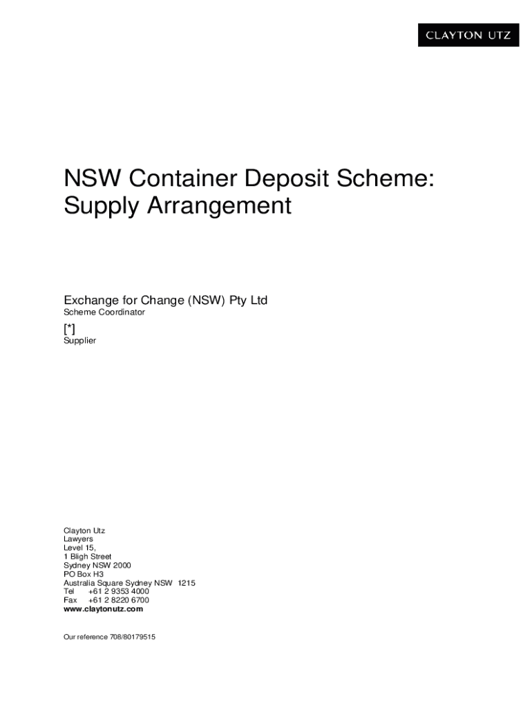 NSW Container Deposit Scheme: Supply ArrangementExchange for Change (NSW) Pty Ltd Scheme Coordinator * Supplier Clayton UTC Lawyers Level 15, 1 Bligh Street Sydney NSW 2000 PO Box H3 Australia Square