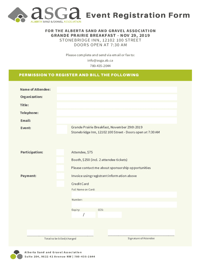 Event Registration Form FOR THE ALBERTA SAND AND GRAVEL ASSOCIATION GRANDE PRAIRIE BREAKFAST NOV 29, 2019 STOCKBRIDGE INN, 12102 100 STREET DOORS OPEN AT 7:30 AM Please complete and send via email
