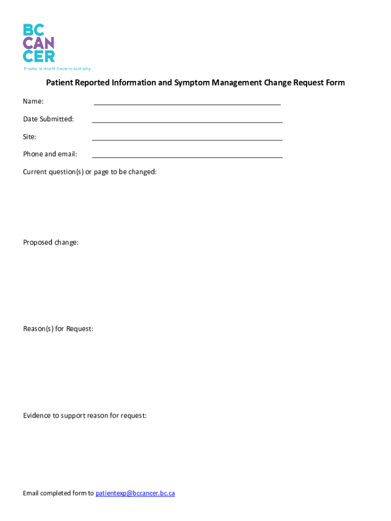 Patient Reported Information and Symptom Management Change Request Form Name: Date Submitted: Site: Phone and email: Current question(s) or page to be changed:Proposed change:Reason(s) for Request:Evidence