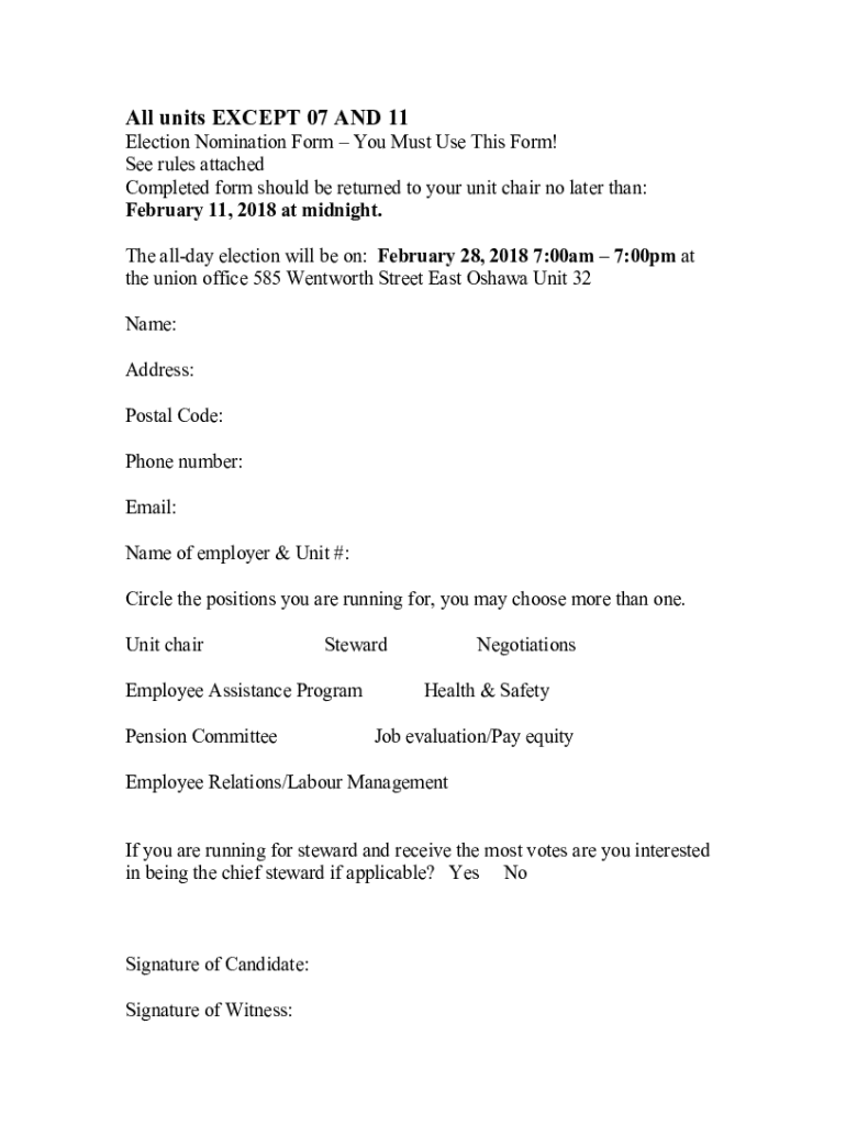 All units EXCEPT 07 AND 11 Election Nomination Form You Must Use This Form! See rules attached Completed form should be returned to your unit chair no later than: February 11, 2018, at midnight. To
