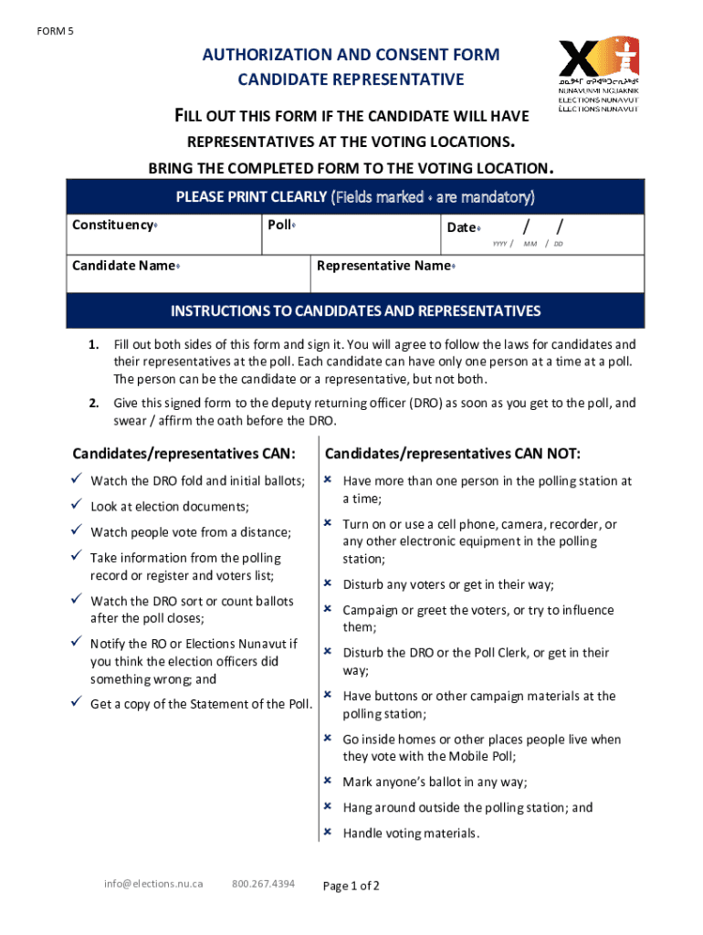 FORM 5AUTHORIZATION AND CONSENT FORM CANDIDATE REPRESENTATIVELY OUT THIS FORM IF THE CANDIDATE WILL HAVE REPRESENTATIVES AT THE VOTING LOCATIONS.BRING THE COMPLETED FORM TO THE VOTING LOCATION. PLEASE