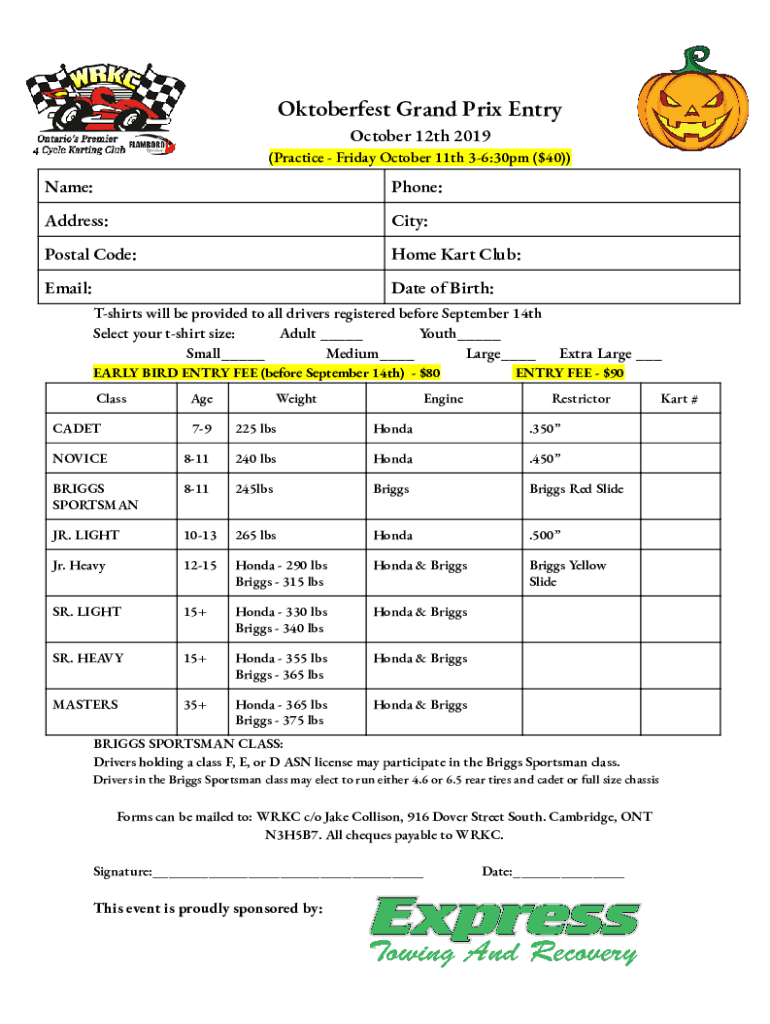 Oktoberfest Grand Prix Entry October 12th 2019 (Practice Friday, October 11th 36:30pm ($40))Name:Phone:Address:City:Postal Code:Home Kart Club:Email:Date of Birth:Shirts will be provided to all drivers