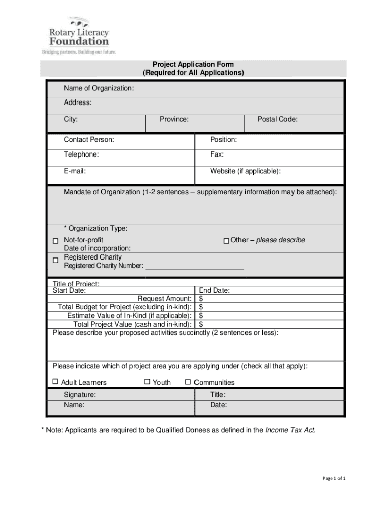 Project Application Form (Required for All Applications) Name of Organization: Address: City:Province:Postal Code:Contact Person:Position:Telephone:Fax:Email:Website (if applicable):Mandate of Organization