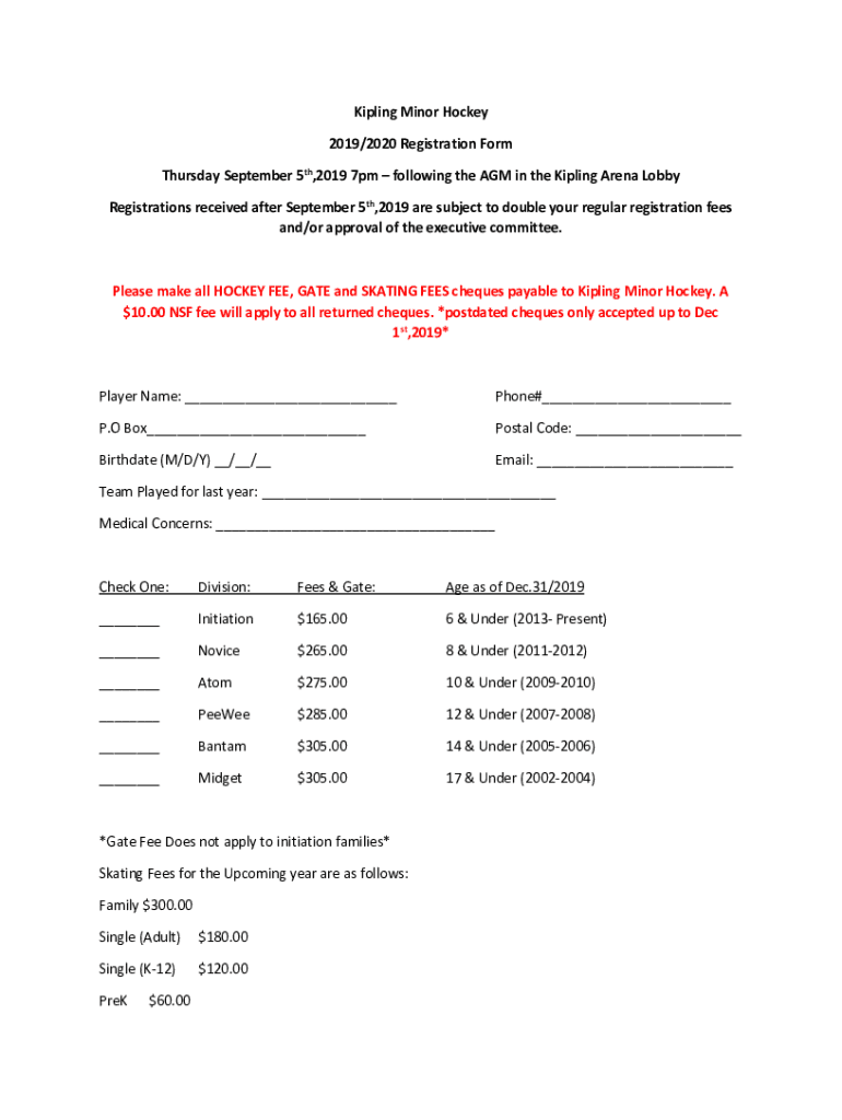 Kipling Minor Hockey 2019/2020 Registration Form Thursday, September 5th,2019 7pm following the AGM in the Kipling Arena Lobby Registrations received after September 5th,2019 are subject to double