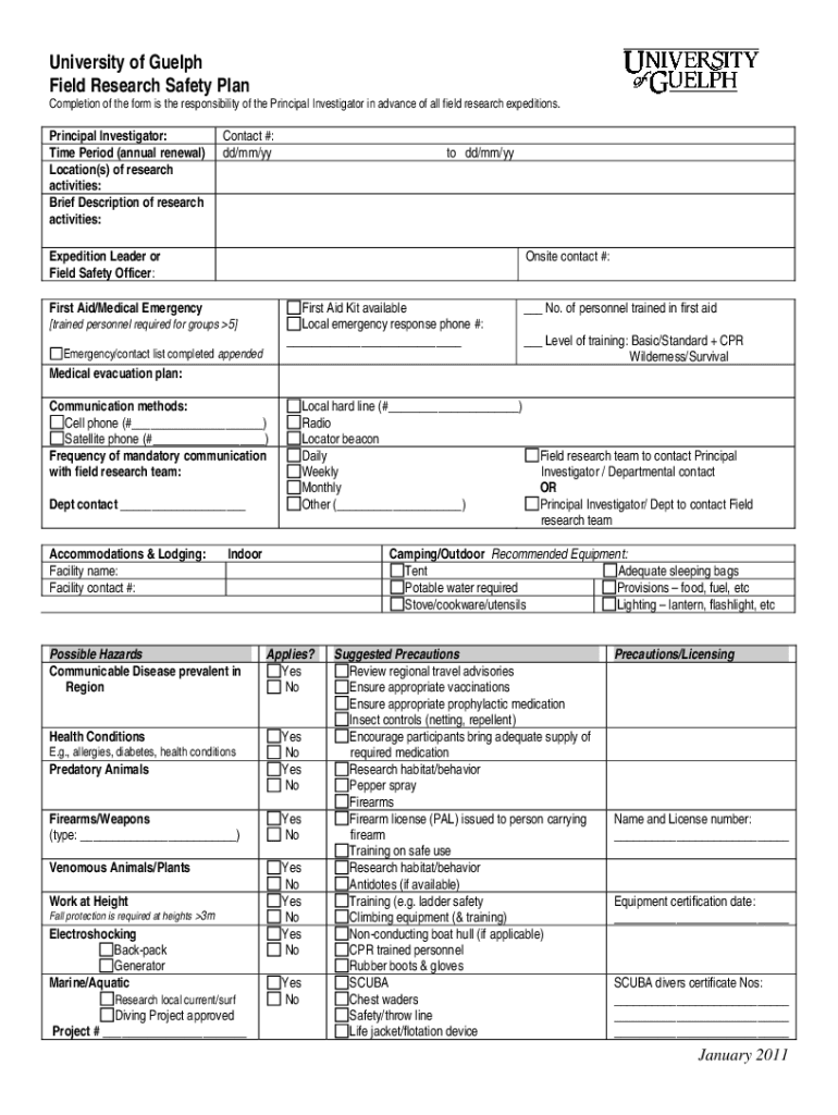 University of Guelph Field Research Safety Incompletion of the form is the responsibility of the Principal Investigator in advance of all field research expeditions. Principal Investigator: Time Period