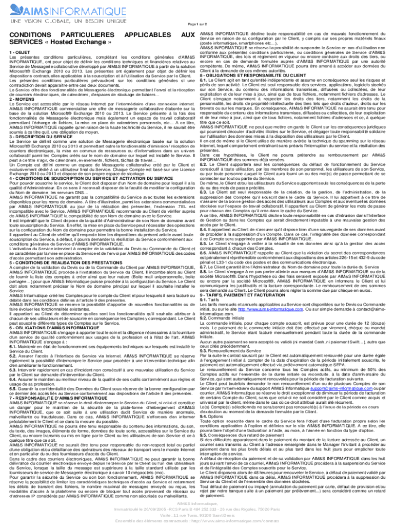 Page 1 SUR 2CONDITIONS PARTICULARS SERVICES Hosted Exchange APPLICABLESAUX1 OBJECT Les presented conditions particulars, compliant LES conditions grades aims INFORMATIVE, ONT pour object DE diner