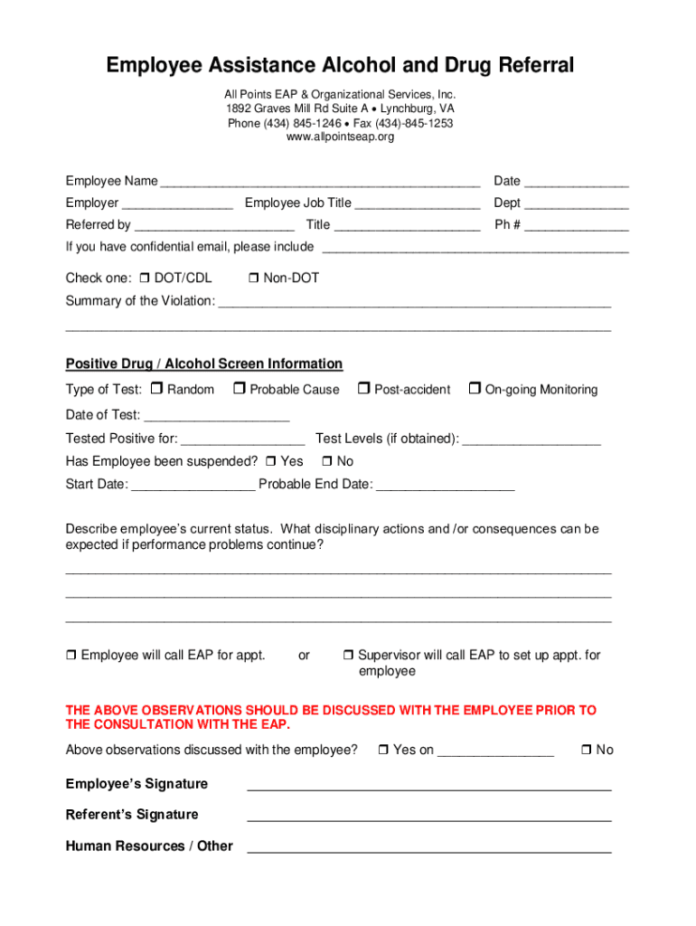 Employee Assistance Alcohol and Drug Referral All Points EAP & Organizational Services, Inc. 1892 Graves Mill Rd Suite A Lynchburg, VA Phone (434) 8451246 Fax (434)8451253 www.allpointseap.orgEmployee