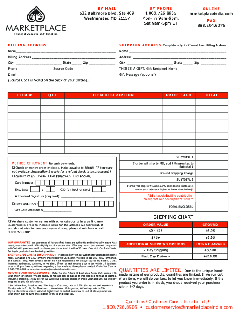 BY MAIL532 Baltimore Blvd, Ste 409 Westminster, MD 21157BY PHONE1.800.726.8905 Mon Fri 9am9pm, Sat 9am5pm ETONLINEmarketplaceindia.com FAX888.294.6376BILLING ADDRESS H I P P I N G A D D R E S Complete