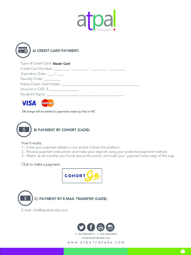 A) CREDIT CARD PAYMENT: Type of Credit Card: Master Card Credit Card Number: Expiration Date: / Security Code: Name Credit Card Holder: Amount in CAD: $ Students Name: 2% charge will be added to payments