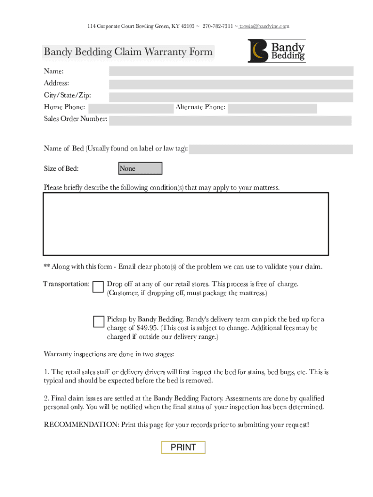 114 Corporate Court Bowling Green, KY 42103 2707827311 Russia bandying. Company Bedding Claim Warranty Form Name: Address: City/State/Zip: Home Phone:Alternate Phone:Sales Order Number:Name of Bed